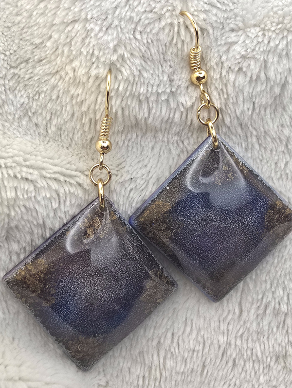 Boucles d’oreilles pendantes carrées – Bleu ciel, violet & éclats cuivrés
