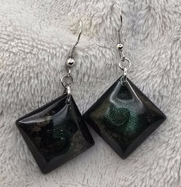 Osez l’originalité avec ces boucles d’oreilles pendantes en forme de carré, habillées d’un vert profond réhaussé de subtiles touches cuivrées. En leur centre, une spirale raffinée attire la lumière et donne à chaque mouvement un éclat unique et moderne.